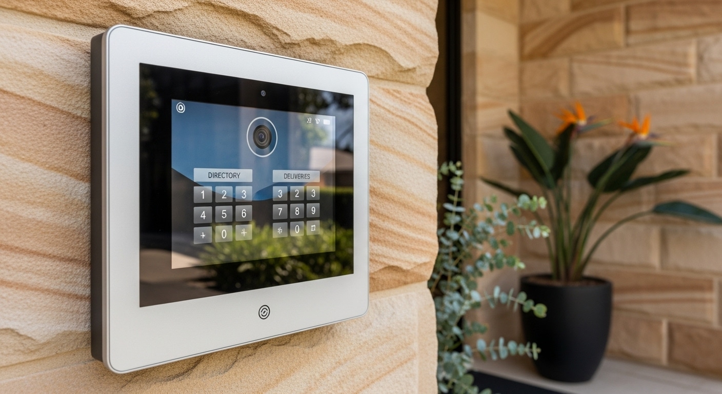 Touchscreen smart intercom installed at a contemporary building entrance in Australia
