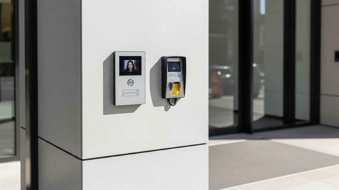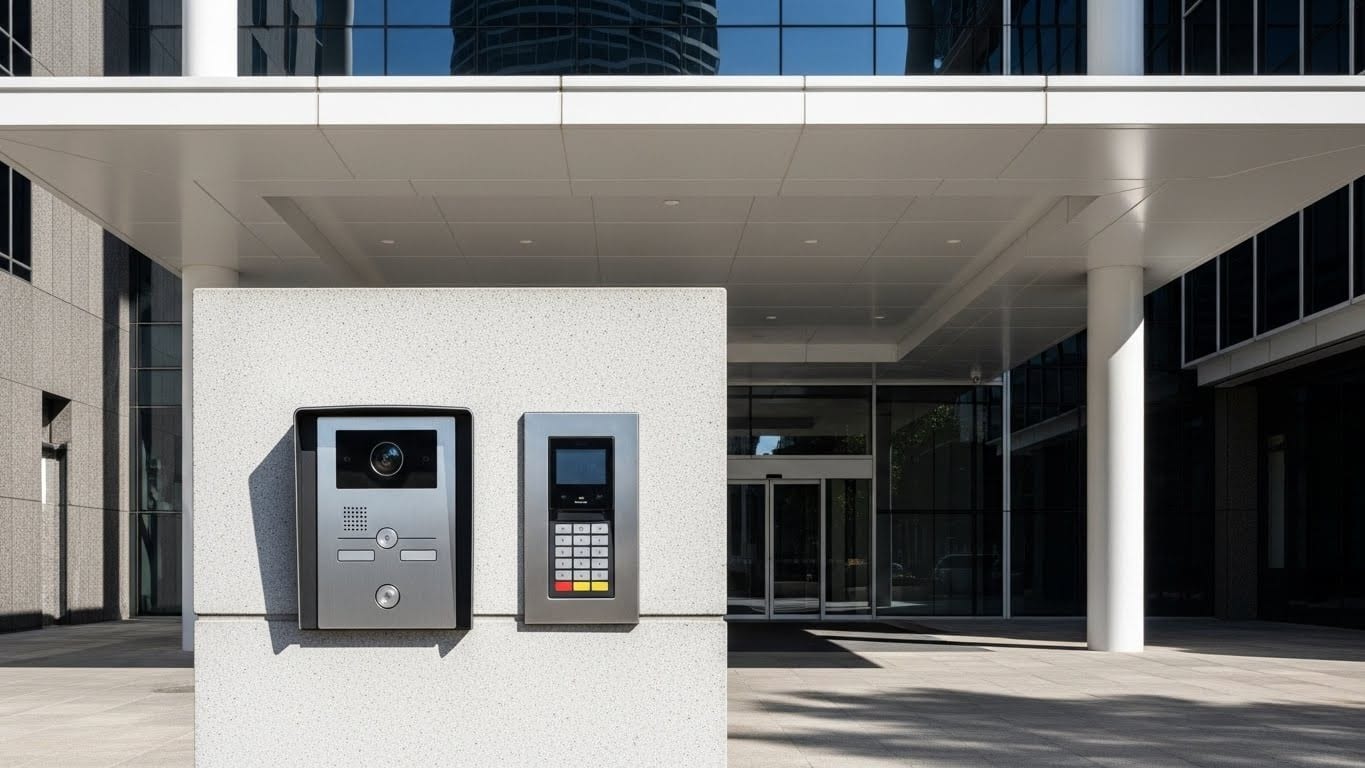 - Access control systems: Employees use existing key cards, intercom handles visitors